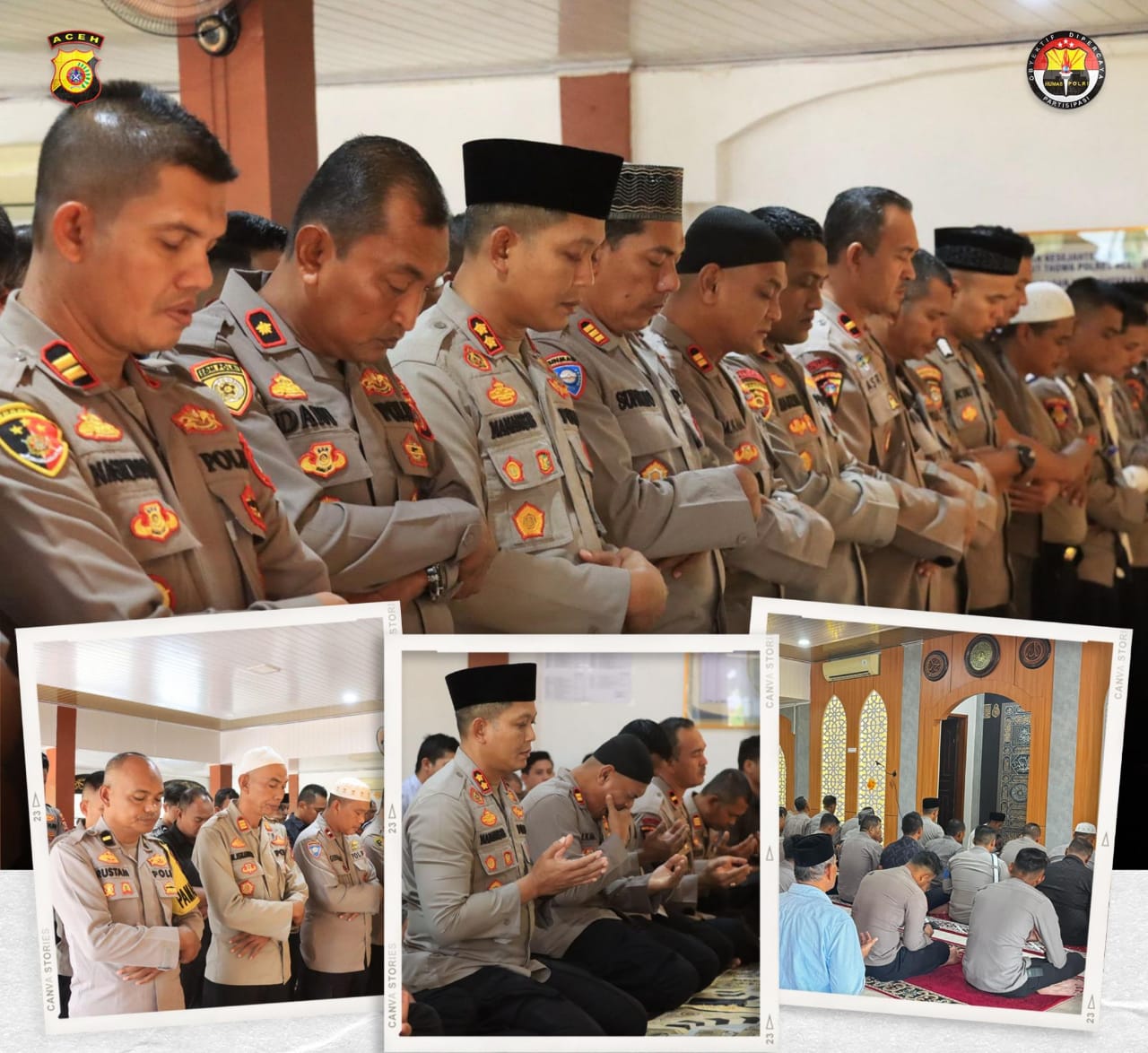 Kepala Kepolisian Resor Aceh Utara AKBP Nanang Indra Bakti, S.H., S.I.K didampingi Wakapolres dan para pejabat utama serta personel Polres Aceh Utara dengan kusyu’ melaksanakan shalat ghaib dan berdoa.