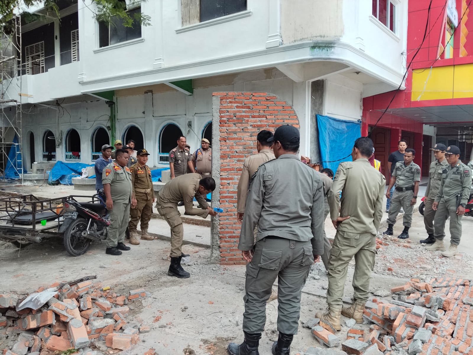 Langsa | Atjeh Terkini.id – Satuan Polisi Pamong Praja (Satpol-PP) Kota Langsa robohkan bangunan tugu dan pagar pembatas yang dinilai liar milik salah satu warung kopi yang berada di Jalan Jend. A Yani di samping Taman Bambu Runcing Langsa, Senin, (17/11/2025).