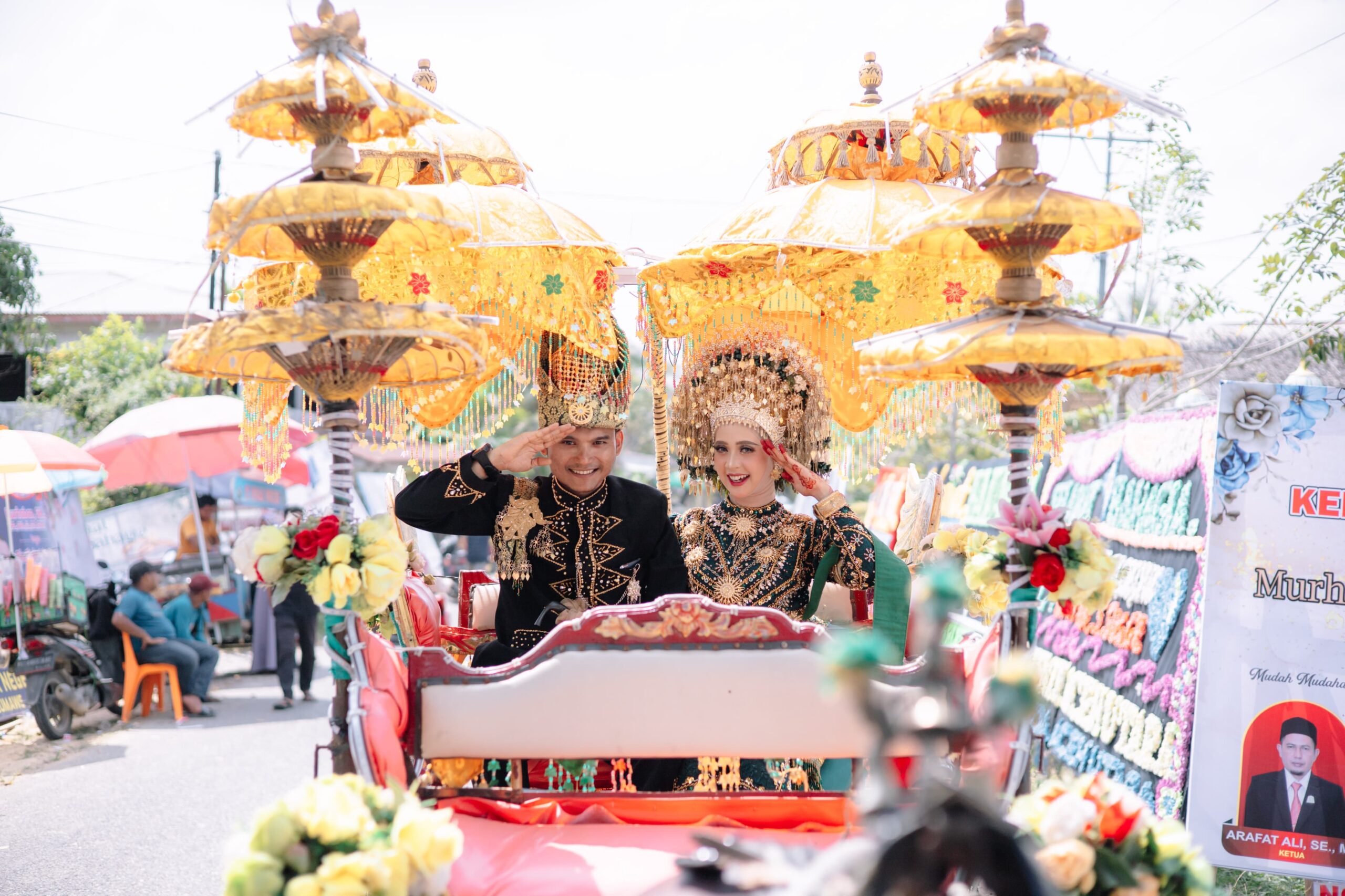 Tak hanya prosesi intat darabaro yang menarik perhatian, resepsi pernikahan pasangan ini walau sederhana namun juga berlangsung megah. Puluhan papan bunga ucapan selamat dari berbagai pihak memenuhi jalan menuju lokasi acara.